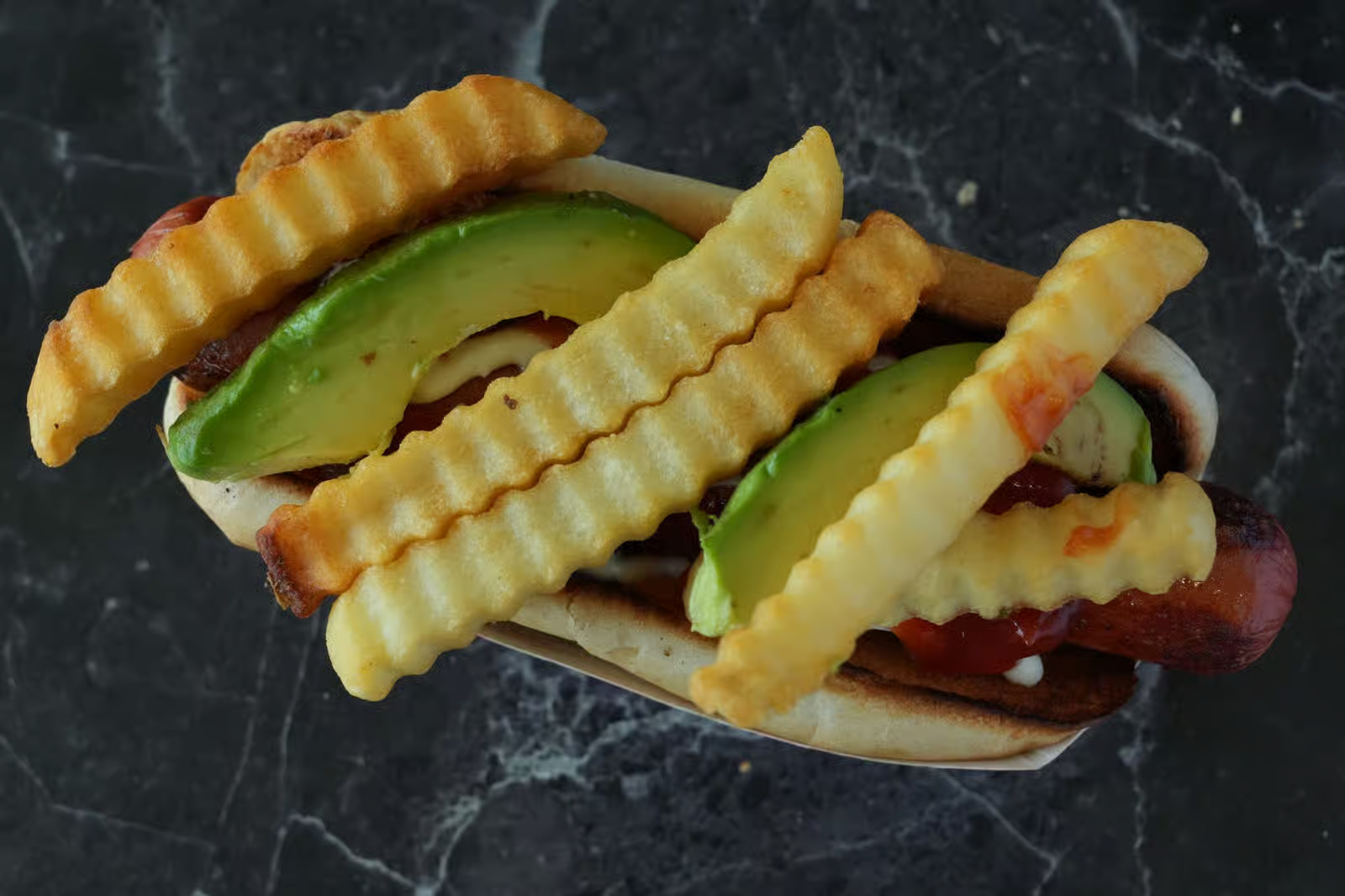 A California style hot dog, bacon wrapped dog with fresh avocados and crispy french fries, nestled in mayo, and ketchup. A Classic favorite.
