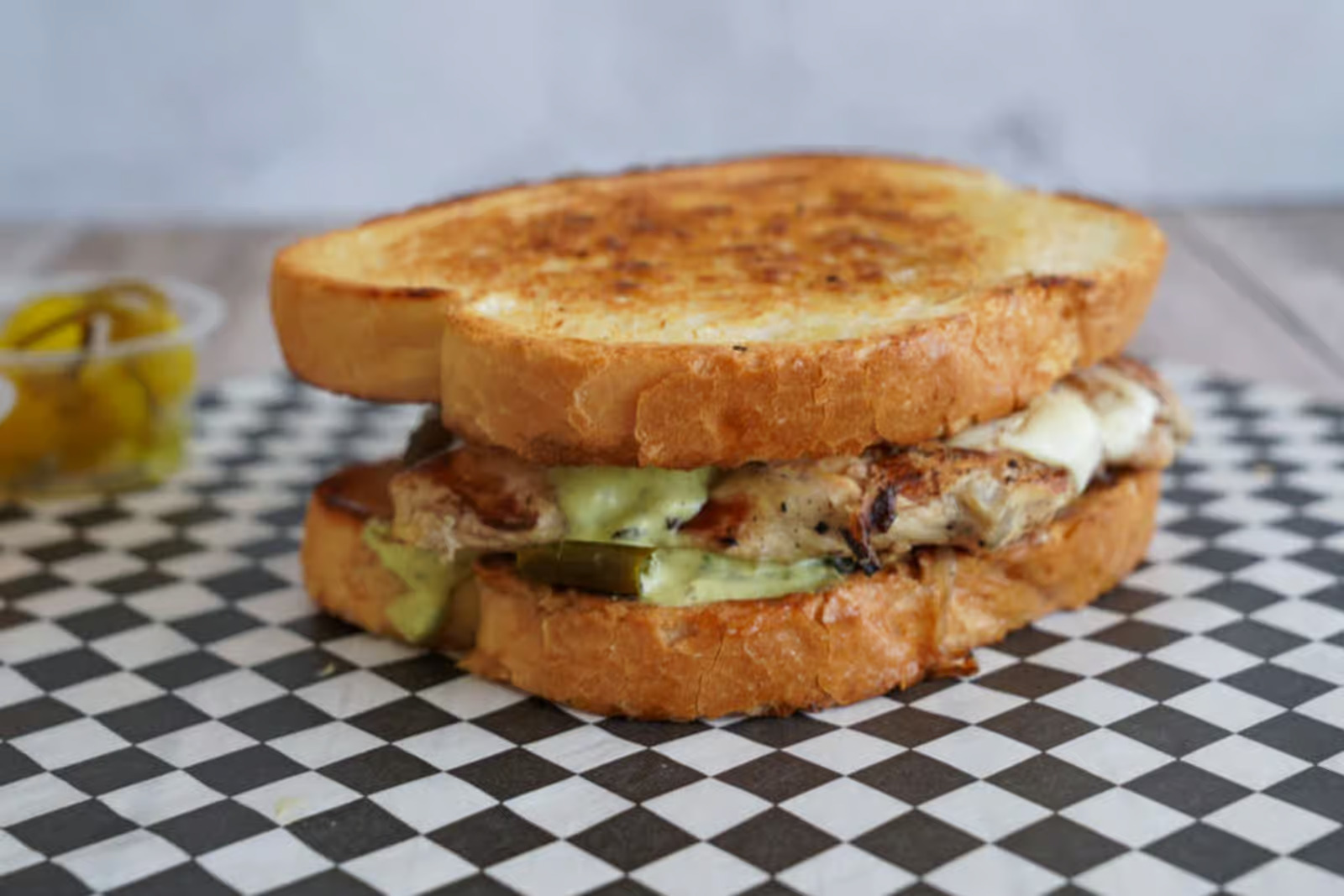 A Must Try! Juicy chicken, melty cheese, and zesty poblano peppers and our house made creamy poblano sauce nestled between two slices of golden toasted bread.
