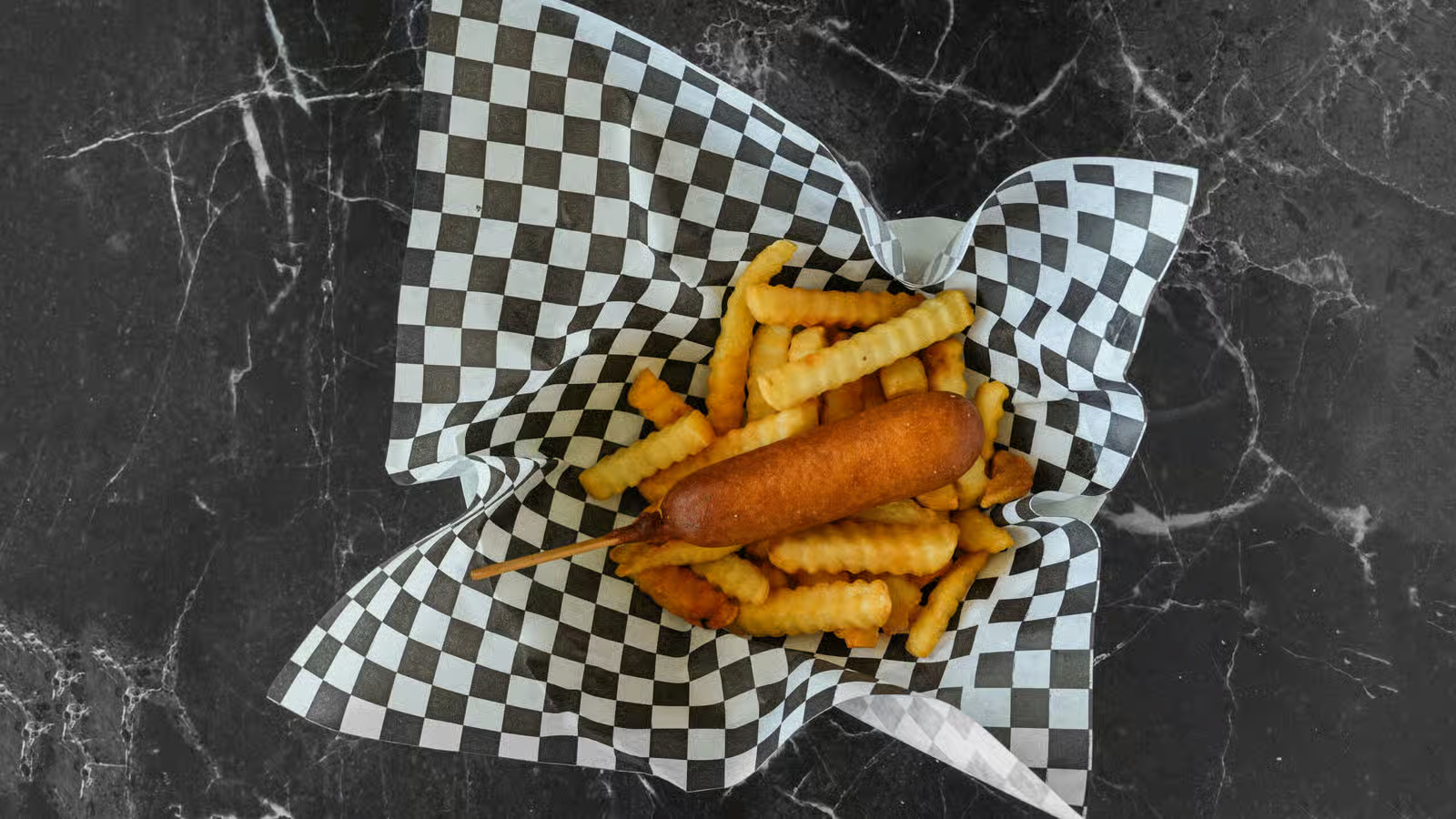 A crispy corn dog paired with a fun pile of crinkle-cut fries.